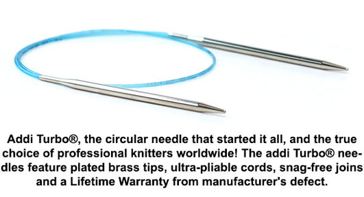 The circular needle that started it all, and the true choice of professional knitters worldwide! The addi Turbo needles feature plated brass tips, ultra-pliable cords, snag-free joins and a lifetime warranty from the manufacturers.