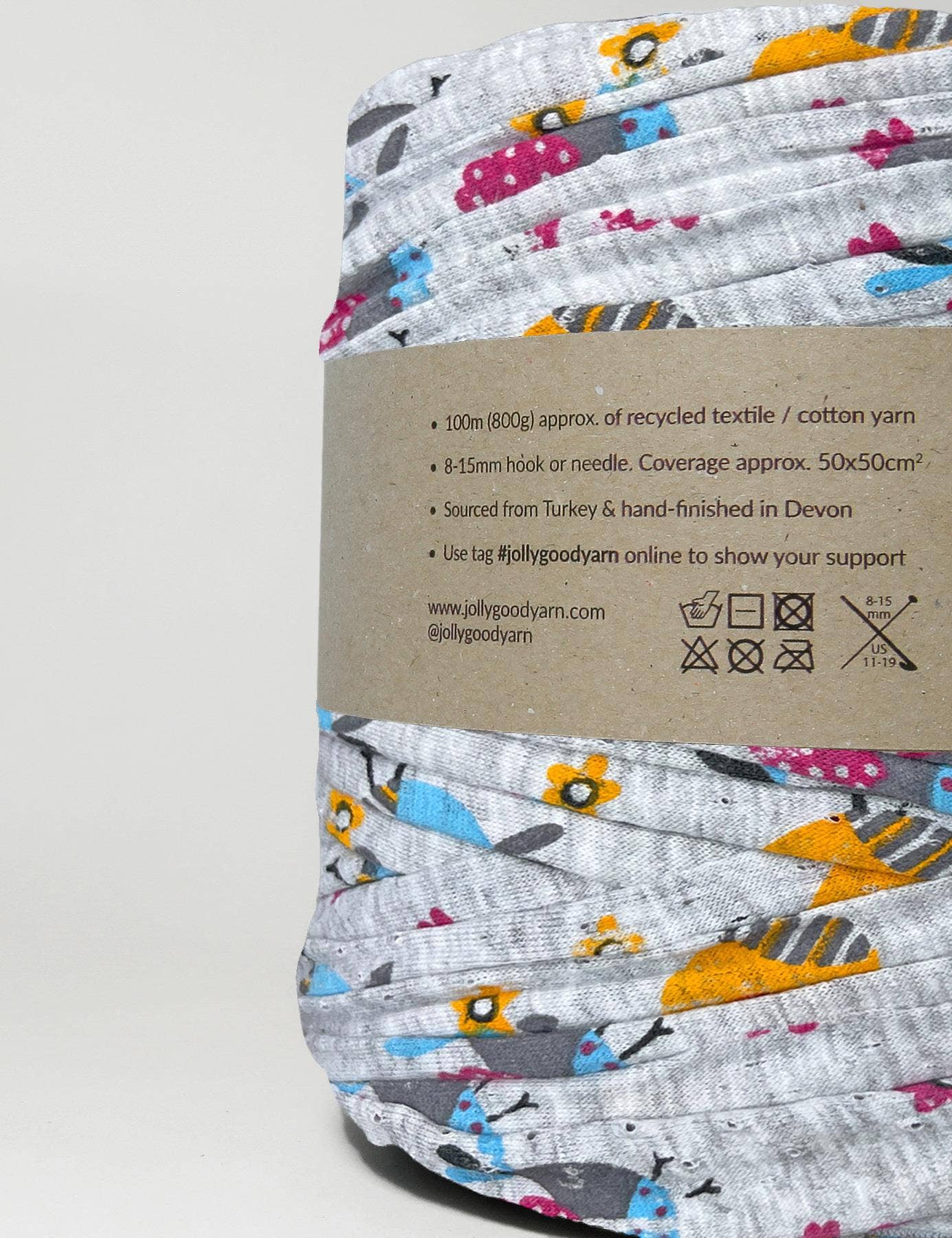 Bird patterned t-shirt yarn from Jolly Good Yarn. This chunky yarn, normally at least 80% cotton, is made from strips of remnant and recycled fabric and textiles. It's popular across the world and goes by a variety of names, such as jersey or spaghetti yarn! Each bobbin provides 100-120m of yarn and typically weighs 800g. Due to its recycled nature, the yarn's length, width and ball weight can vary and it might contain joins. This is a wonderfully soft, washable, and versatile eco-friendly yarn that is perfect for crochet, macrame, weaving, loom knitting and more.