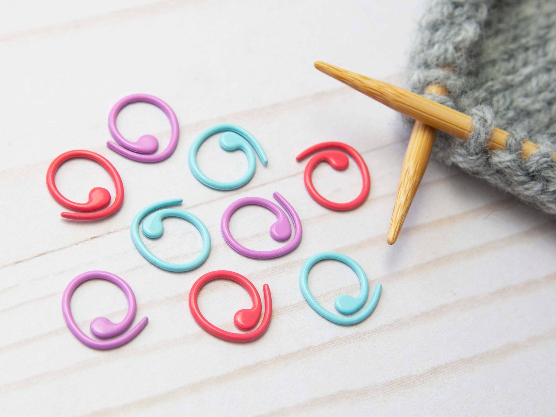These cute split ring stitch markers help you keep track of your projects while knitting or crocheting away. They come in a pack of 9. Made of metal with a pretty colored coating.