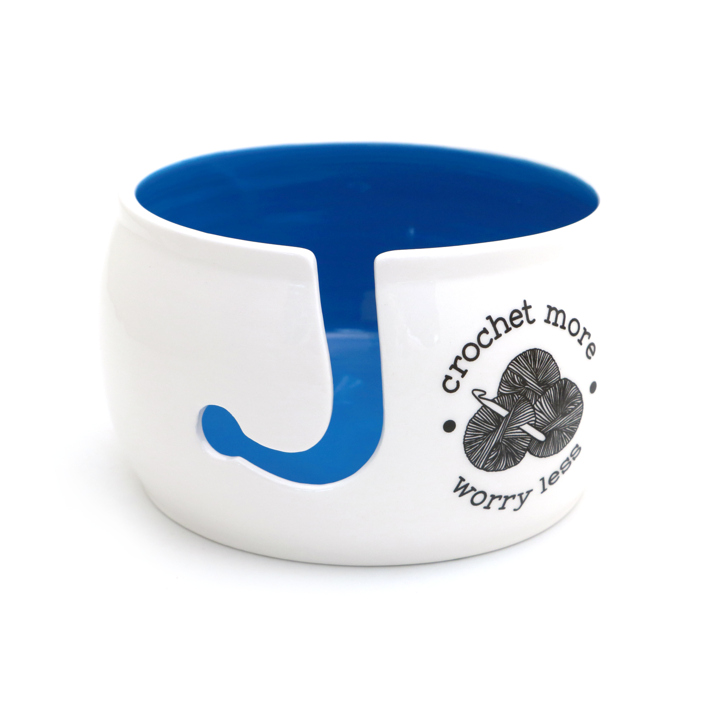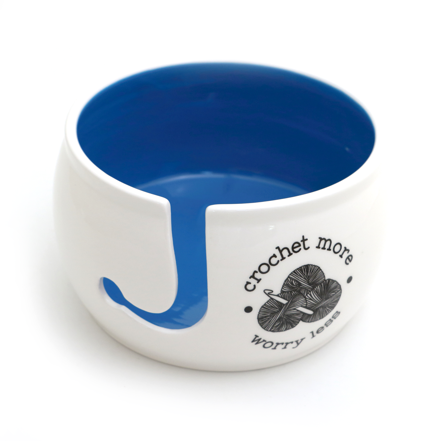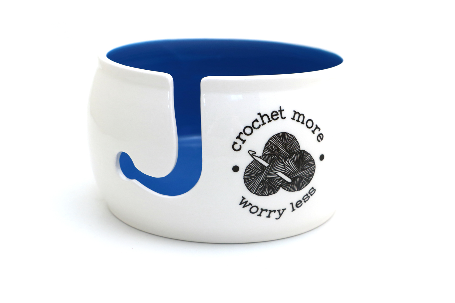 Handmade ceramic yarn bowl reads Crochet More, Worry Less. Spend your time making, not worrying! Created from stoneware clay, kiln fired twice to over 1900 degrees. Interior is blue. This large yarn bowl measures 6.25 inches wide and 3.5 inches high and features a wool release hook. Yarn and hook not included.