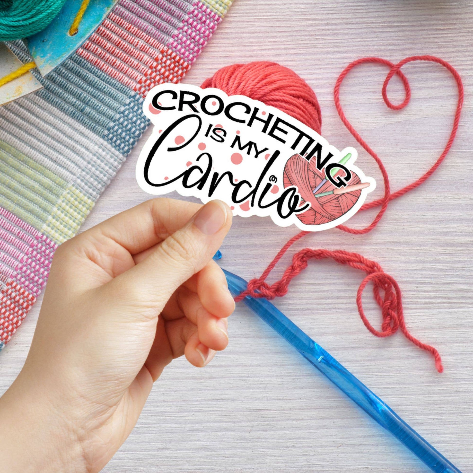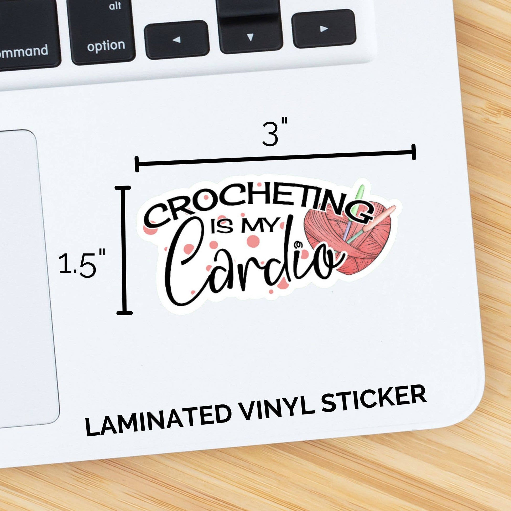 Add a dash of crochet love to anything with this vibrant vinyl sticker! Perfect for those who craft their hearts out, this water-resistant die-cut sticker boasts a delightful design: 'Crocheting Is My Cardio' paired with a heart-shaped ball of yarn and charming crochet hooks. It's a whimsical, durable gift that crocheters will adore. They can be used for water bottles, laptops, notebooks, and more. Spread the joy of crochet with this delightful sticker!