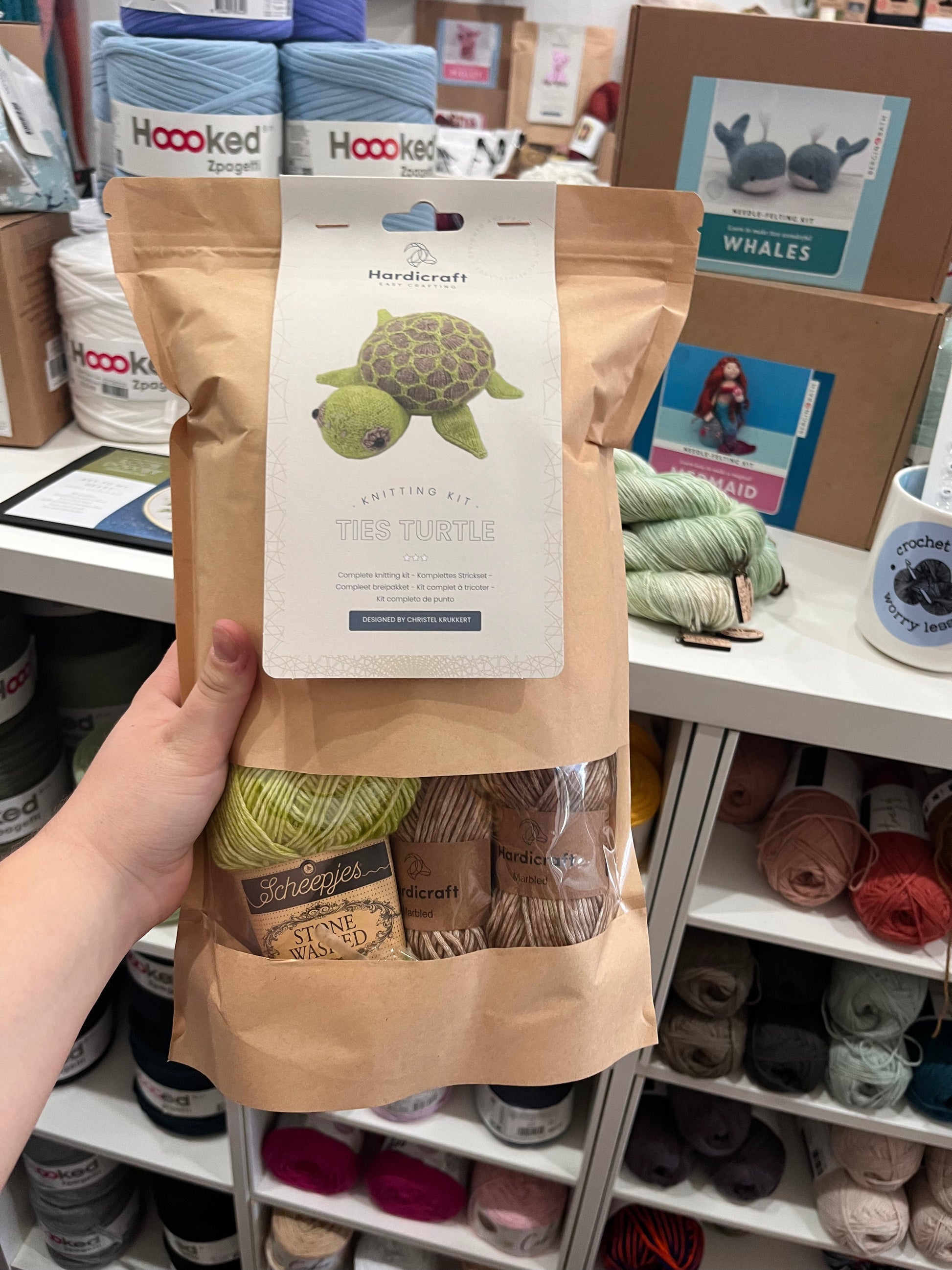 Knit yourself a gentle giant of the sea with the Hardicraft Ties Turtle knitting kit. Ties is a kiwi green and seashell brown sea turtle you can handmake. She comes pre-packaged in eco-friendly bags with high-quality yarn and detailed instructions, ready to come home and be made by you!