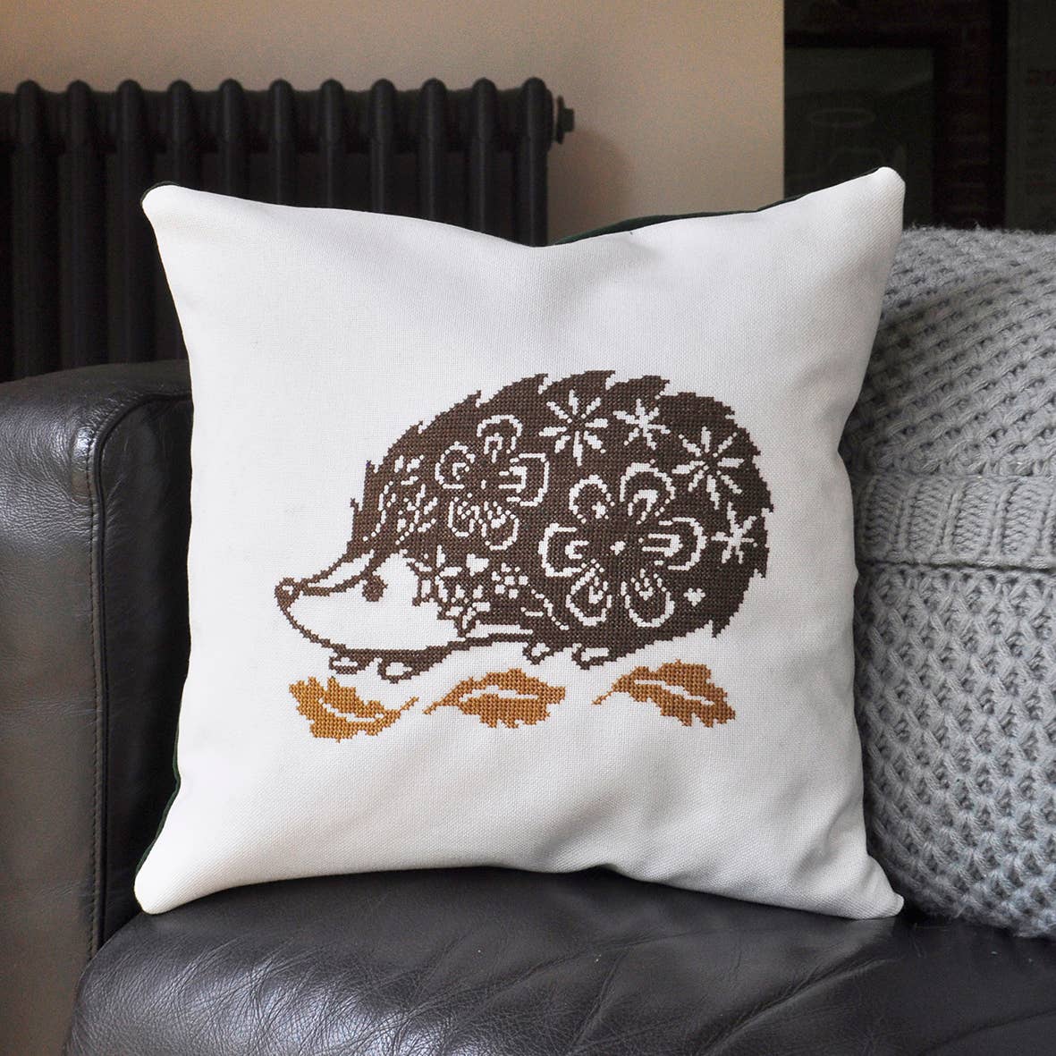 This friendly hedgehog frolicking in Autumn leaves, makes a lovely cross stitch kit.