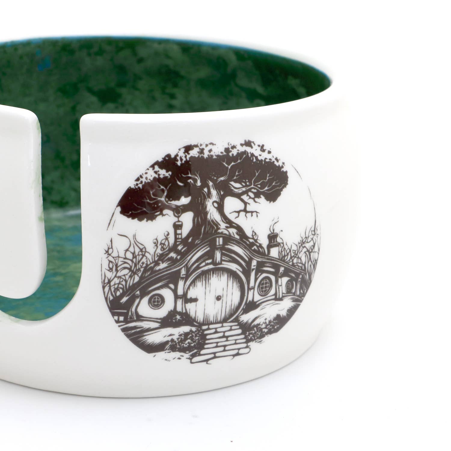 The mystical doorway on this yarn bowl could be a door to a Hobbit Hole or the entrance to a fairy house, depending if you'd rather be in the Shire or amongst the Fae. Interior is a lush collection of green tones- no two are exactly alike. Yarn bowls are a great way to keep yarn from getting tangled and to store work in progress. Handmade in my New Jersey studio. Features a hooked exit to remove the yarn. YARN AND HOOK NOT INCLUDED. Measures 6.25 x 3.5 high and weighs 2.25 lbs. when packaged for shipping.
