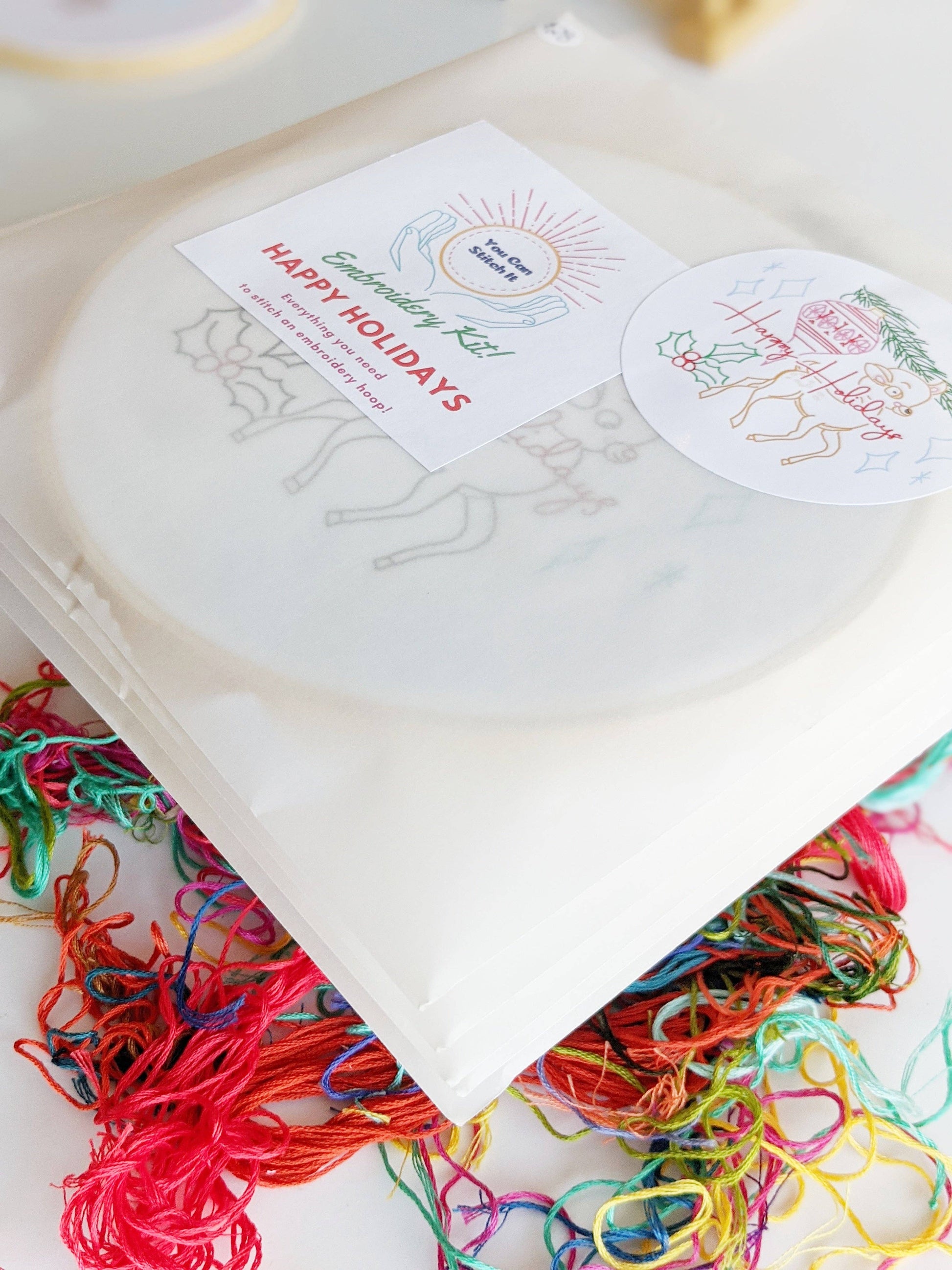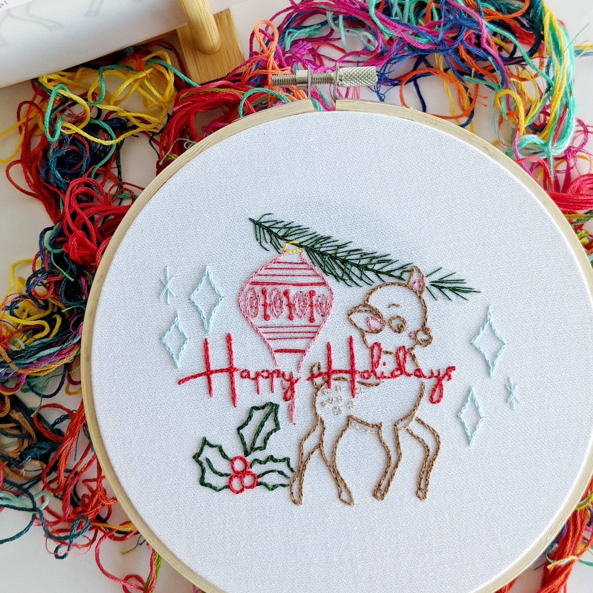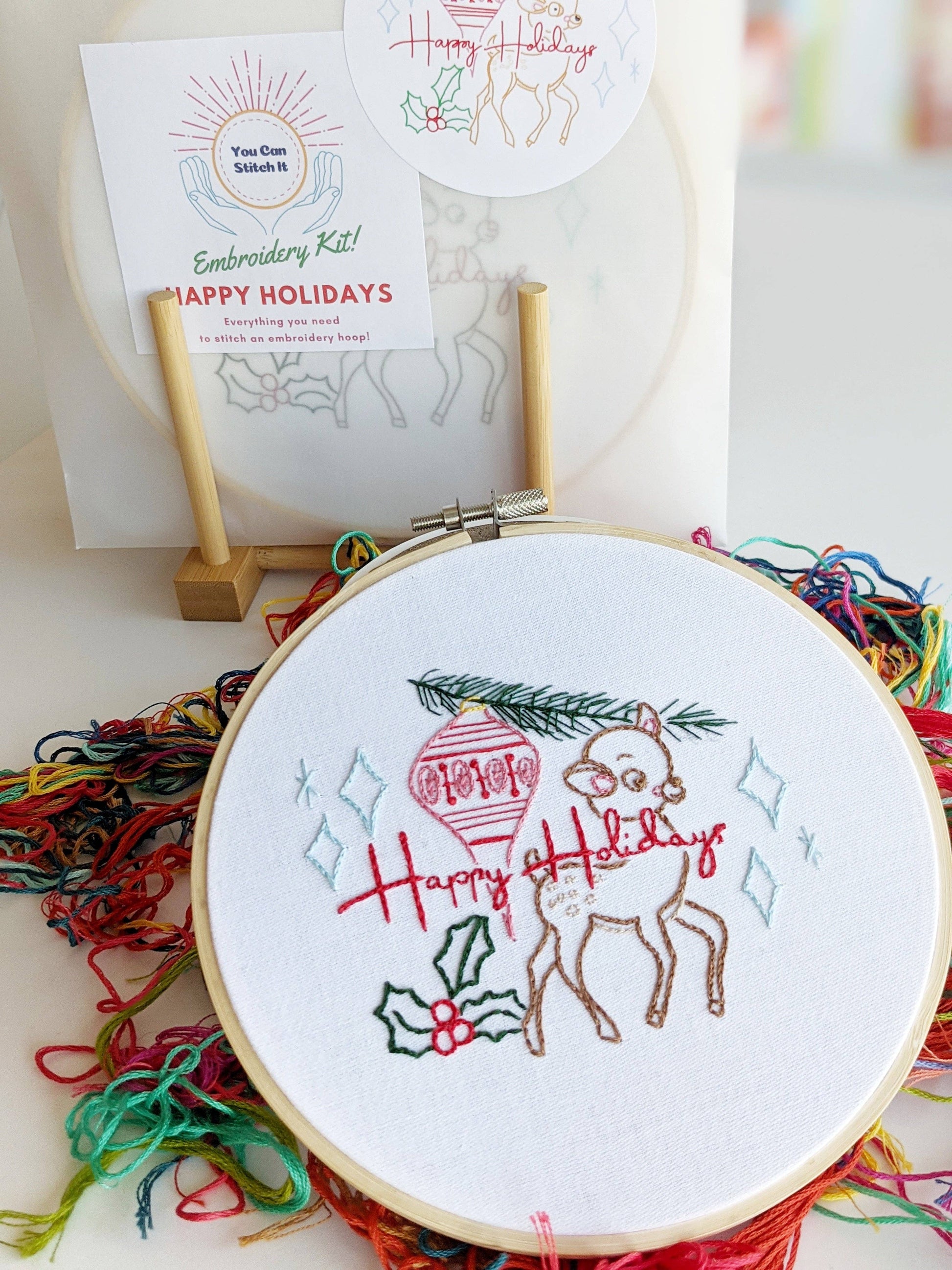 -’Holiday Deer' Kit comes with a 7 inch wooden/bamboo hoop, 2 needles and a needle threader. Thread colors shown are what comes with the kit. If you would like to change up the colors, send me a message!