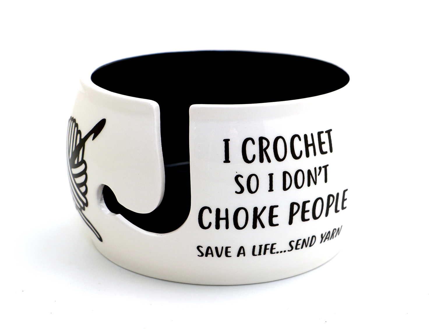 Handmade ceramic yarn bowl reads I Crochet so I Don't Choke People, Save a life...send yarn. Funny gift for someone who crochets - like giving them anger management classes in a warm and fuzzy way! Created from stoneware clay, kiln fired twice to over 1900 degrees. Interior is black. This large yarn bowl measures 6.25 inches wide and 3.5 inches high and features a wool release hook.