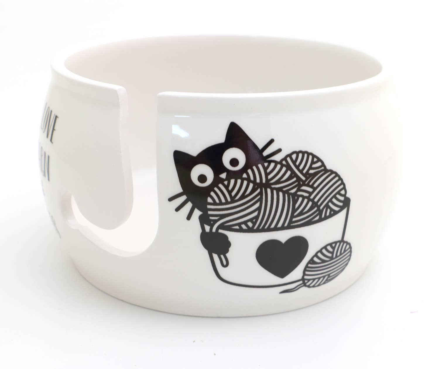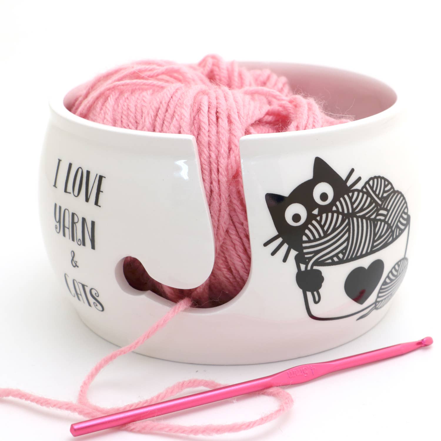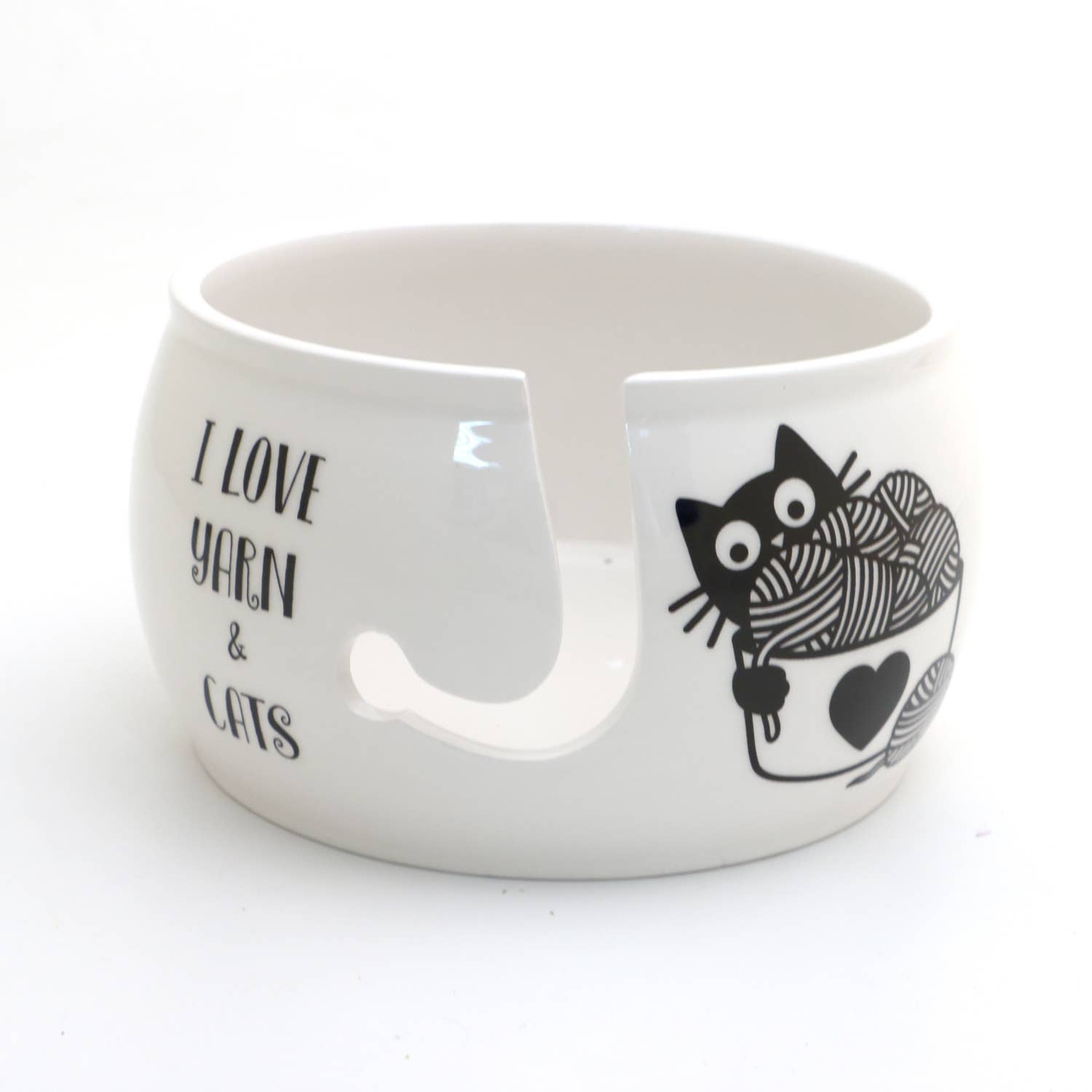 Handmade ceramic yarn bowl reads I Love Yarn and Cats. Purrrfect gift for a cat mom or dad who likes to knit or crochet. Created from stoneware clay, kiln fired twice to over 1900 degrees. Interior is white. This large yarn bowl measures 6.5inches wide and 3.5 inches high and features a wool release hook.