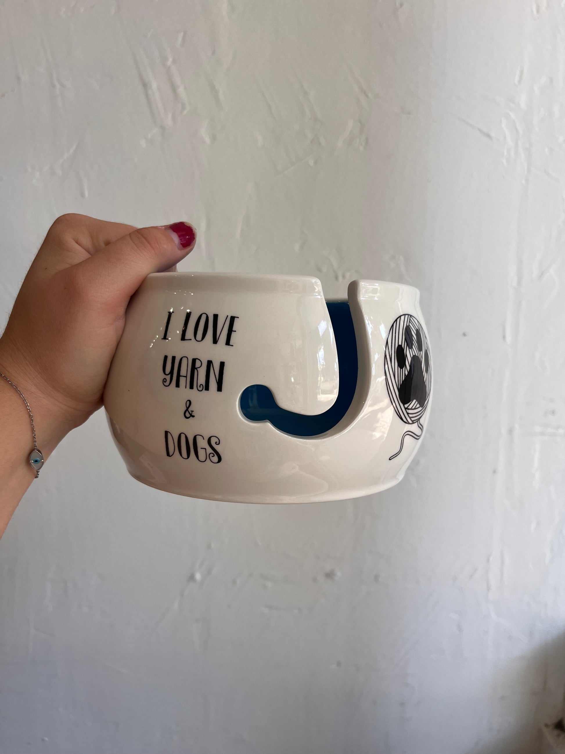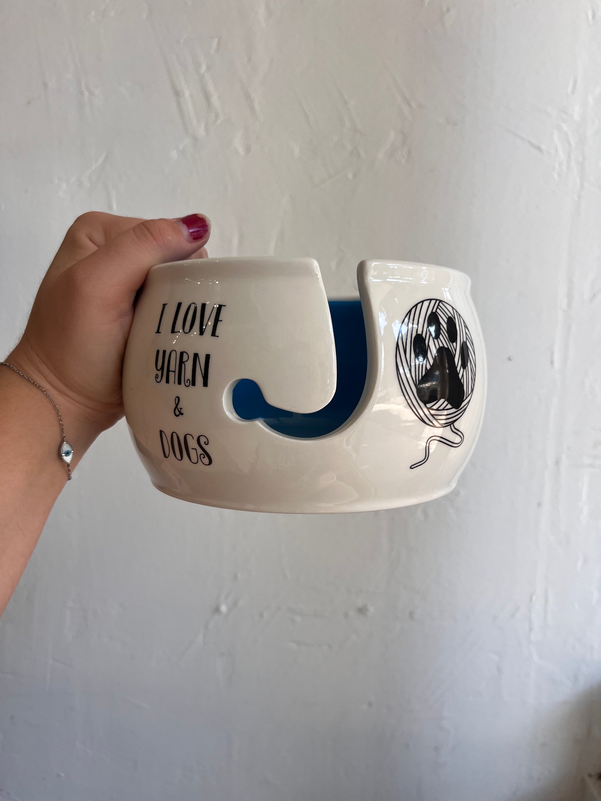 Handmade ceramic yarn bowl reads I Love Dogs and Yarn. Paws and reflect while knitting or crocheting using this large yarn keeper. Created from stoneware clay, kiln fired twice to over 1900 degrees. Interior is turquoise blue. This large yarn bowl measures 6.25 inches wide and 3.5 inches high and features a wool release hook.