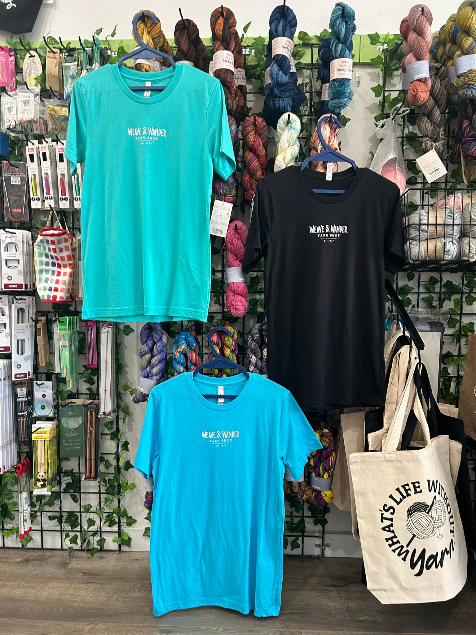 Premium cotton t-shirt with Weave & Wander logo on the front and Not All Who Wander are Lost on the back. True to size.