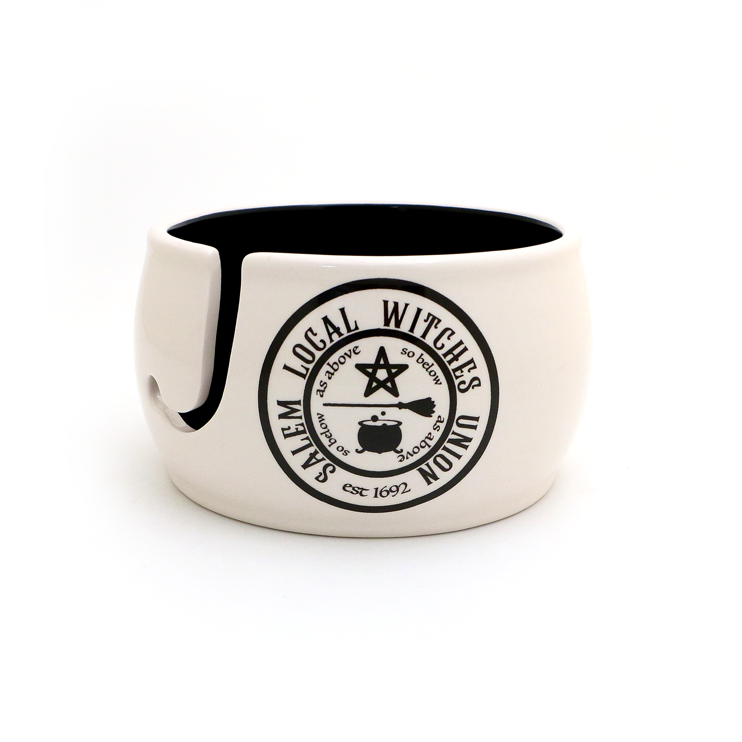 This is a handmade yarn bowl has a white exterior that features a logo for the Salem Local Witches Union- a group of badass women! Interior is jet black with a witchy red swirl in the bottom. Great gift for someone who likes practical magic. Yarn bowls are a great way to keep yarn from getting tangled and to store work in progress. Handmade in my New Jersey studio. Features a hooked exit to remove the yarn.