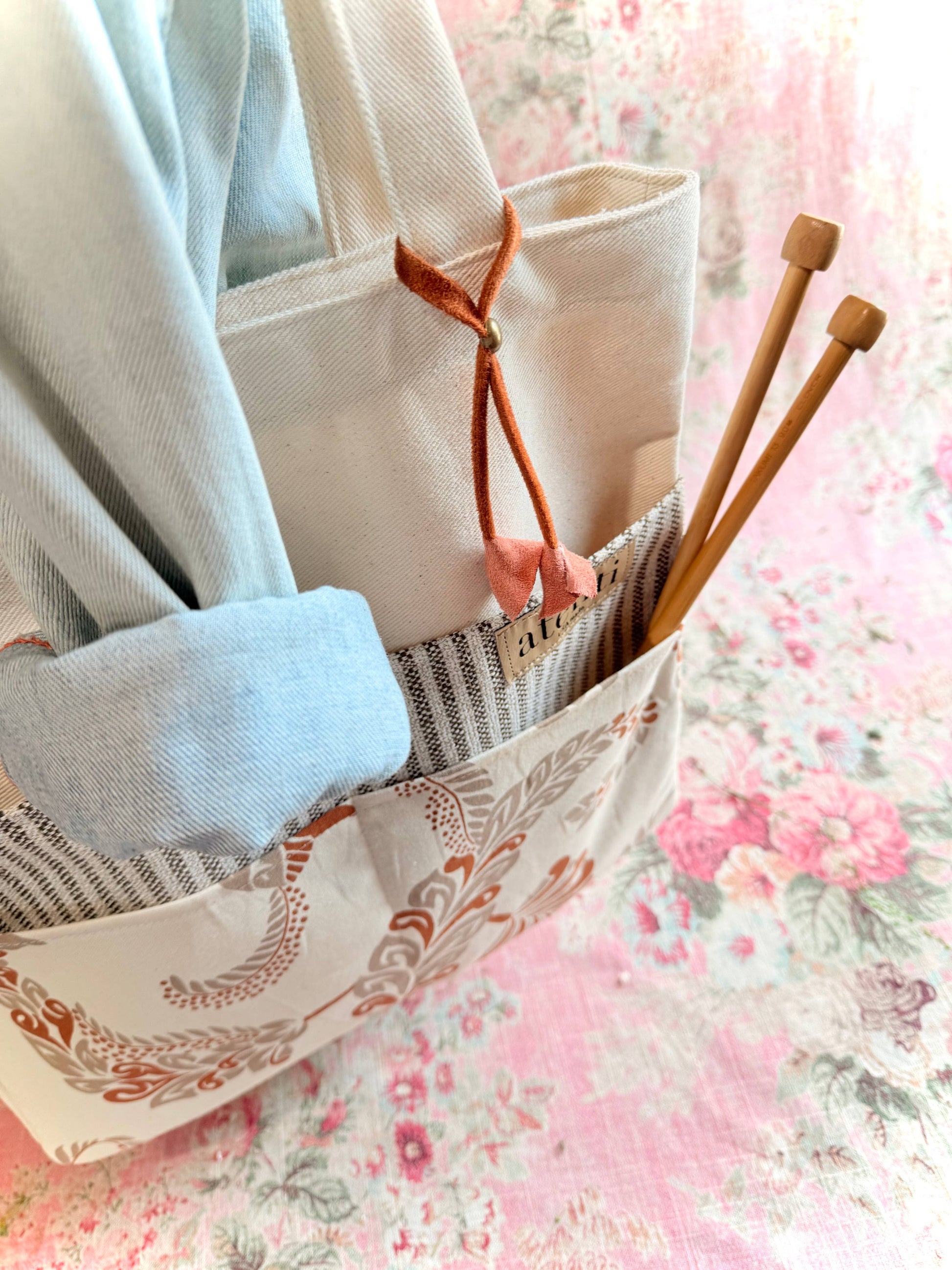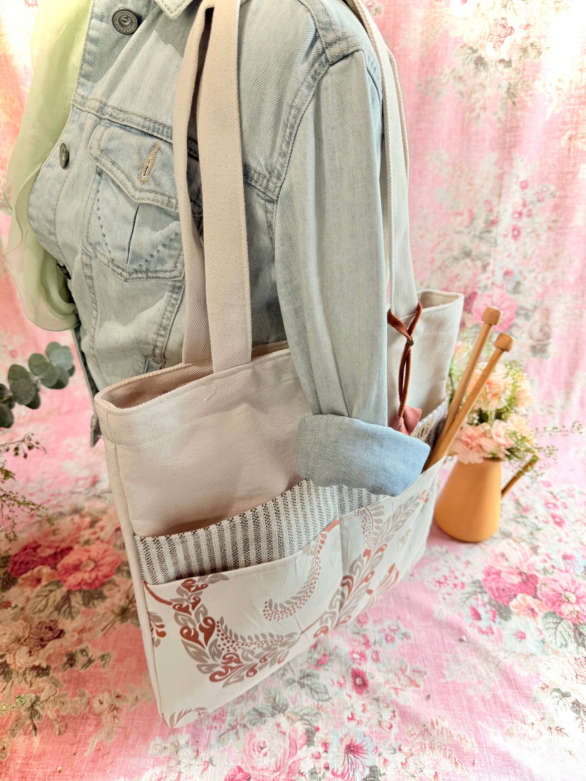 An elegant framed desert floral design with strong Spanish influence. A heavy cotton linen in a colorful Suzani patterned print- same design but different color way from our Santa Monica. The bright colors are artfully showcased against a sandy background. This bag has a soft tote style design with 4 open pockets on the outside. Each one features a unique combination of fabrics and patterns, non lined. Handles have a 10inch drop, and each design comes with an Atenti, signature, handmade tassel decoration. These bags are ideal for carrying projects, groceries, books, or everyday items, and everyday market bag! MSRP: Wholesale price times 2.2 (minimum) Dimension: 14Wx14.5T