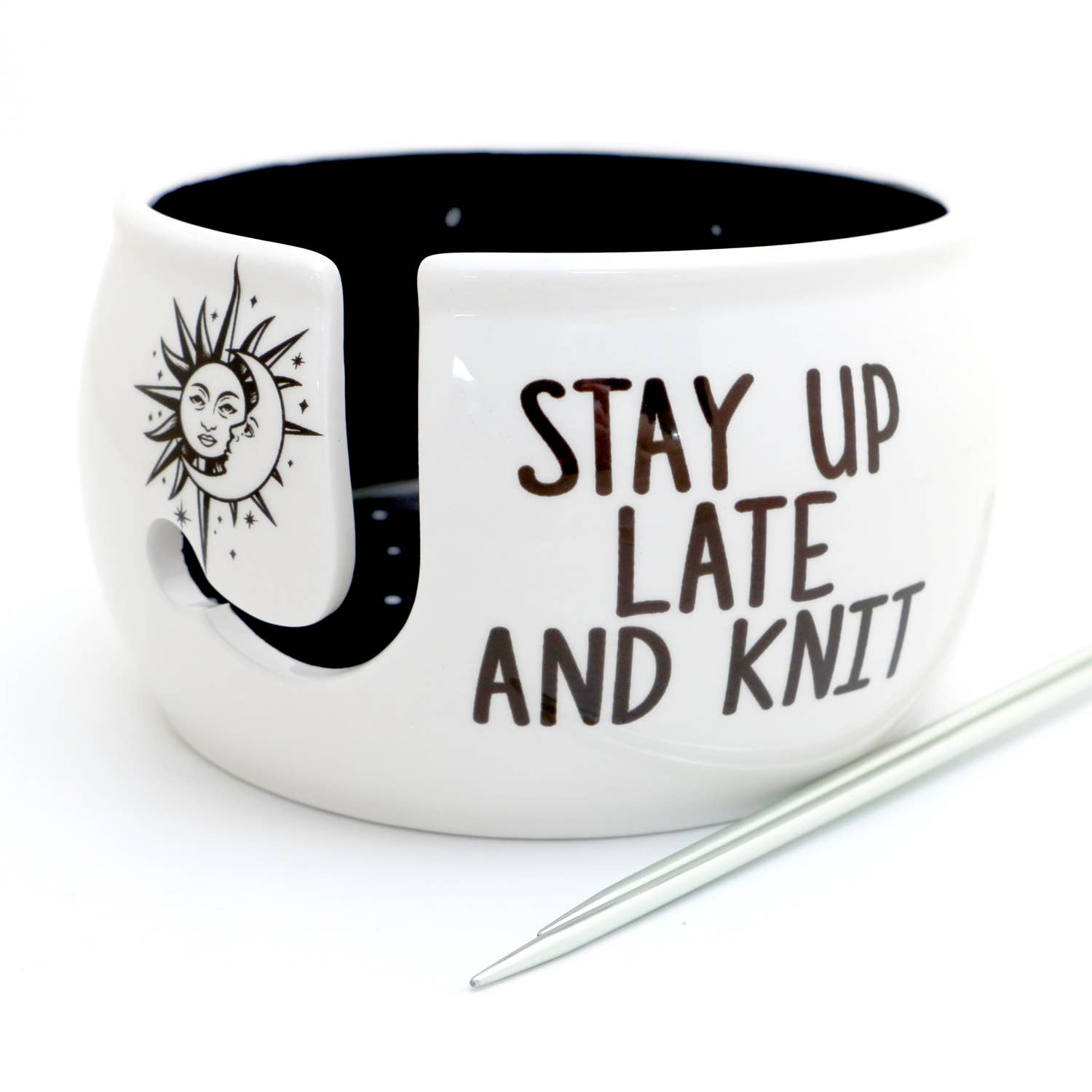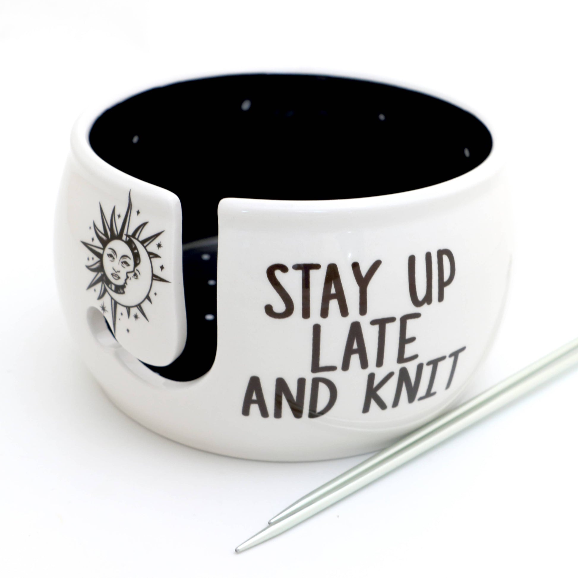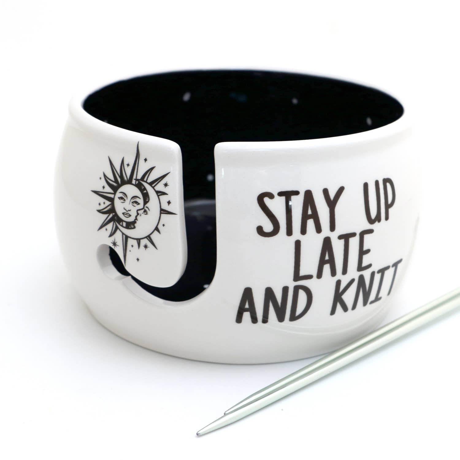 Funny gift for someone who is a night owl and a maker. Created from stoneware clay, kiln fired twice to over 1900 degrees. This large yarn bowl measures 6.25 inches wide and 3.5 inches high and features a wool release hook. Yarn and needles are photo props only and not included in sale.