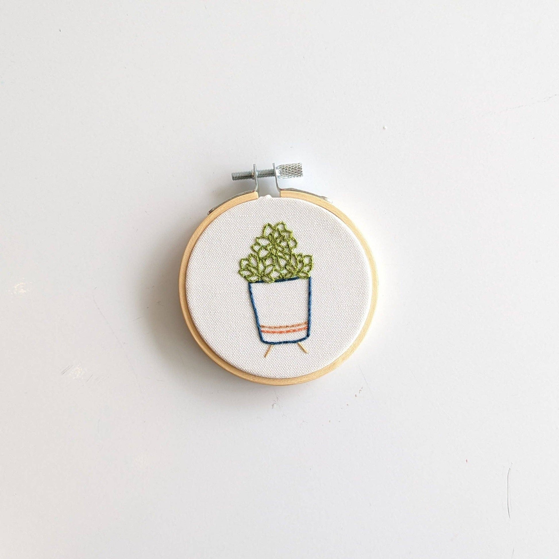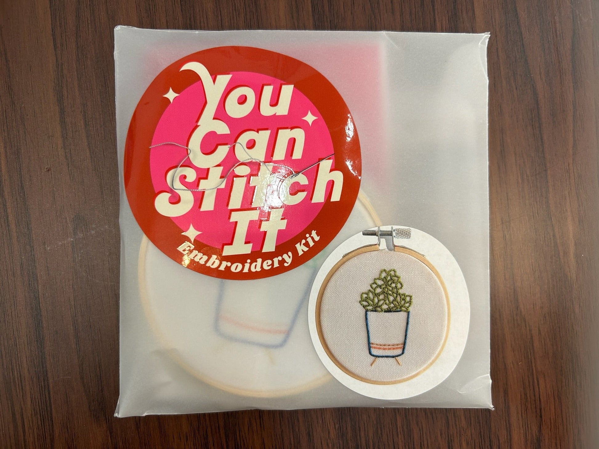 This succulent kit comes with a 3 inch wooden/bamboo hoop, 2 needles, pre-printed pattern, thread and thread guide!