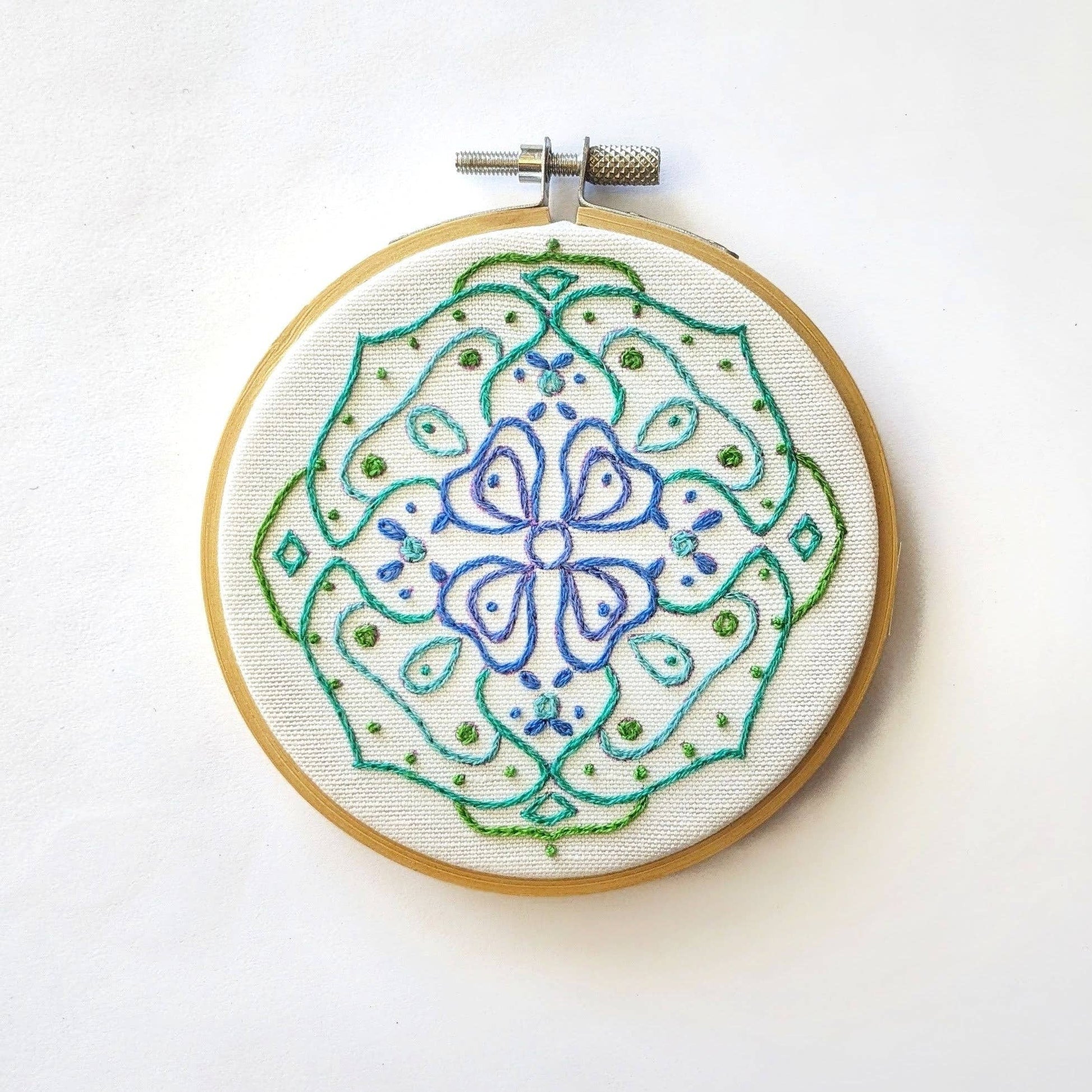 -'Symmetry' Kit comes with a 4 inch wooden/bamboo hoop, 2 needles, pre-printed pattern, thread and thread guide!