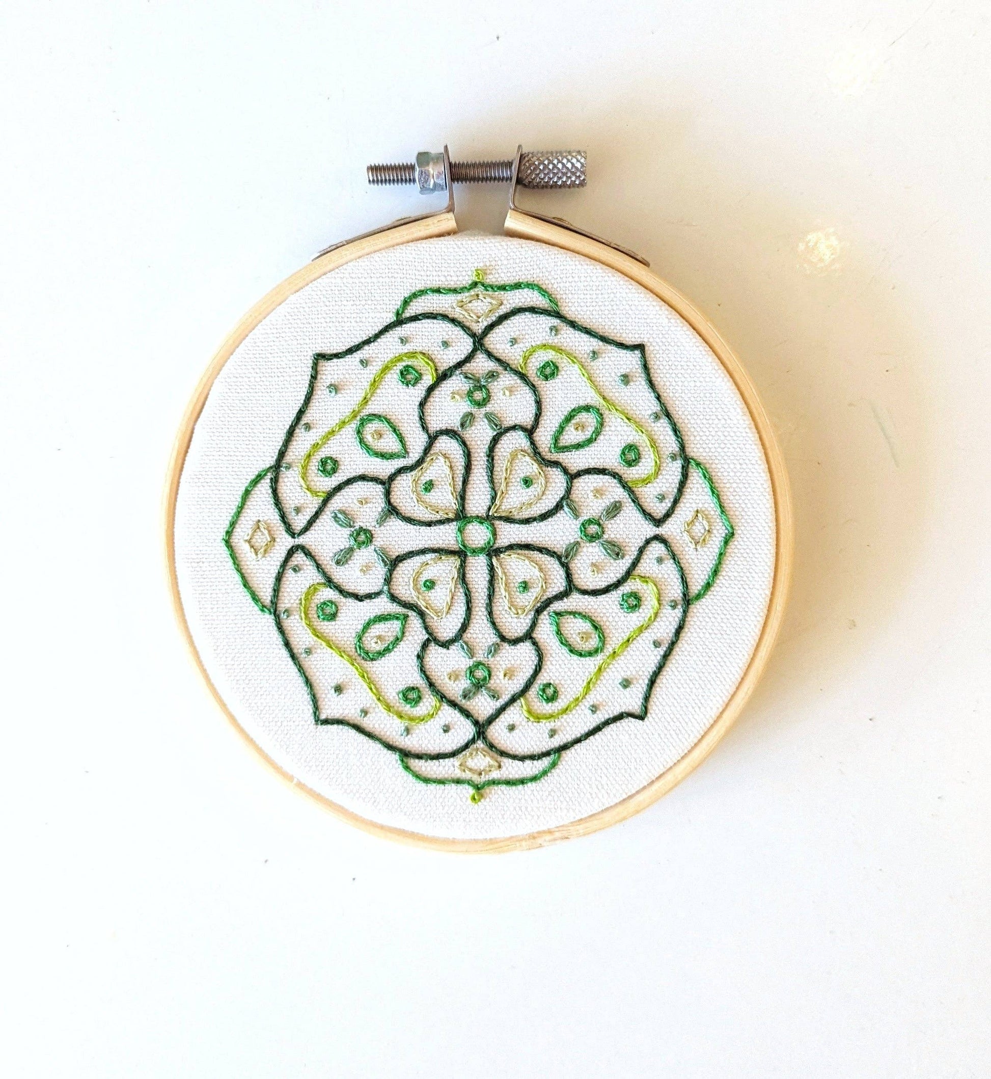 -Symmetry Kit comes with a 4 inch wooden/bamboo hoop, 2 needles, pre-printed pattern, thread and thread guide!