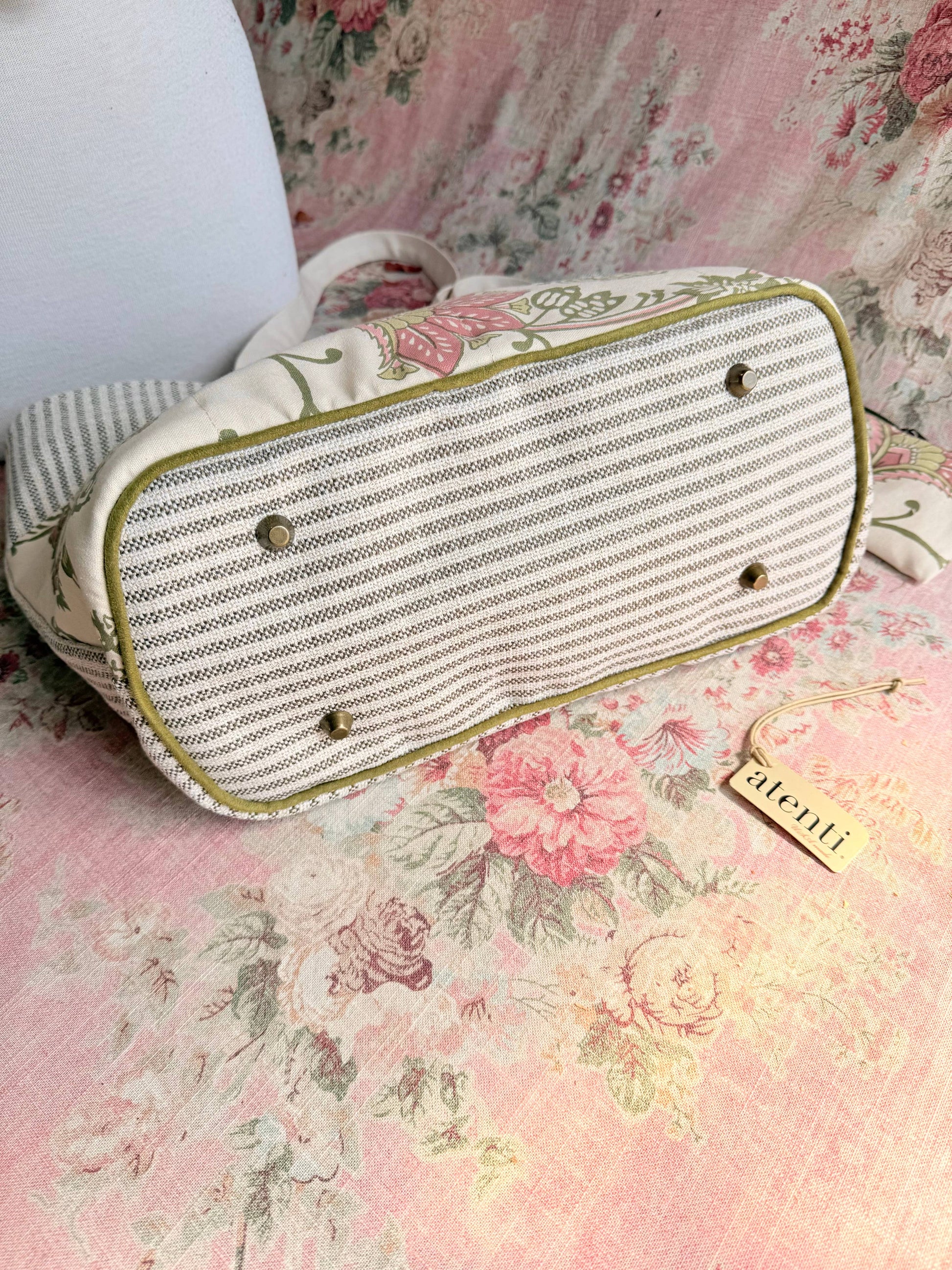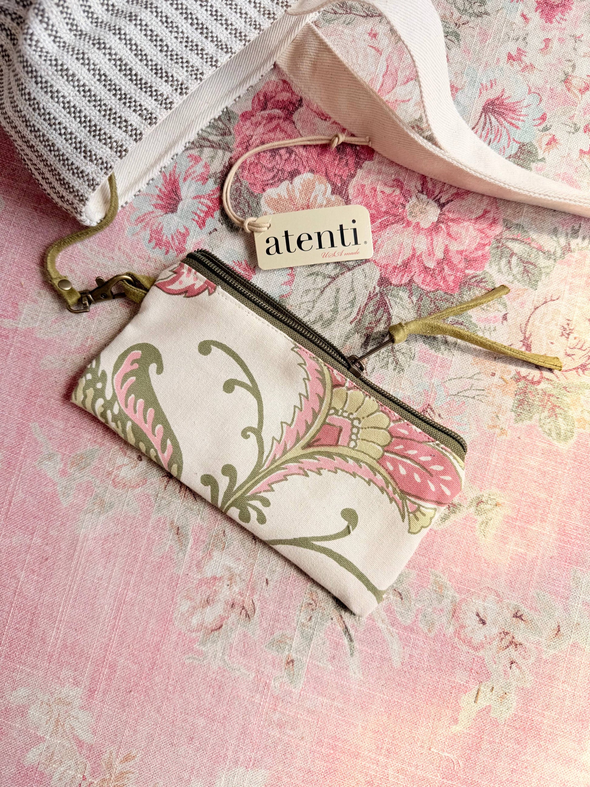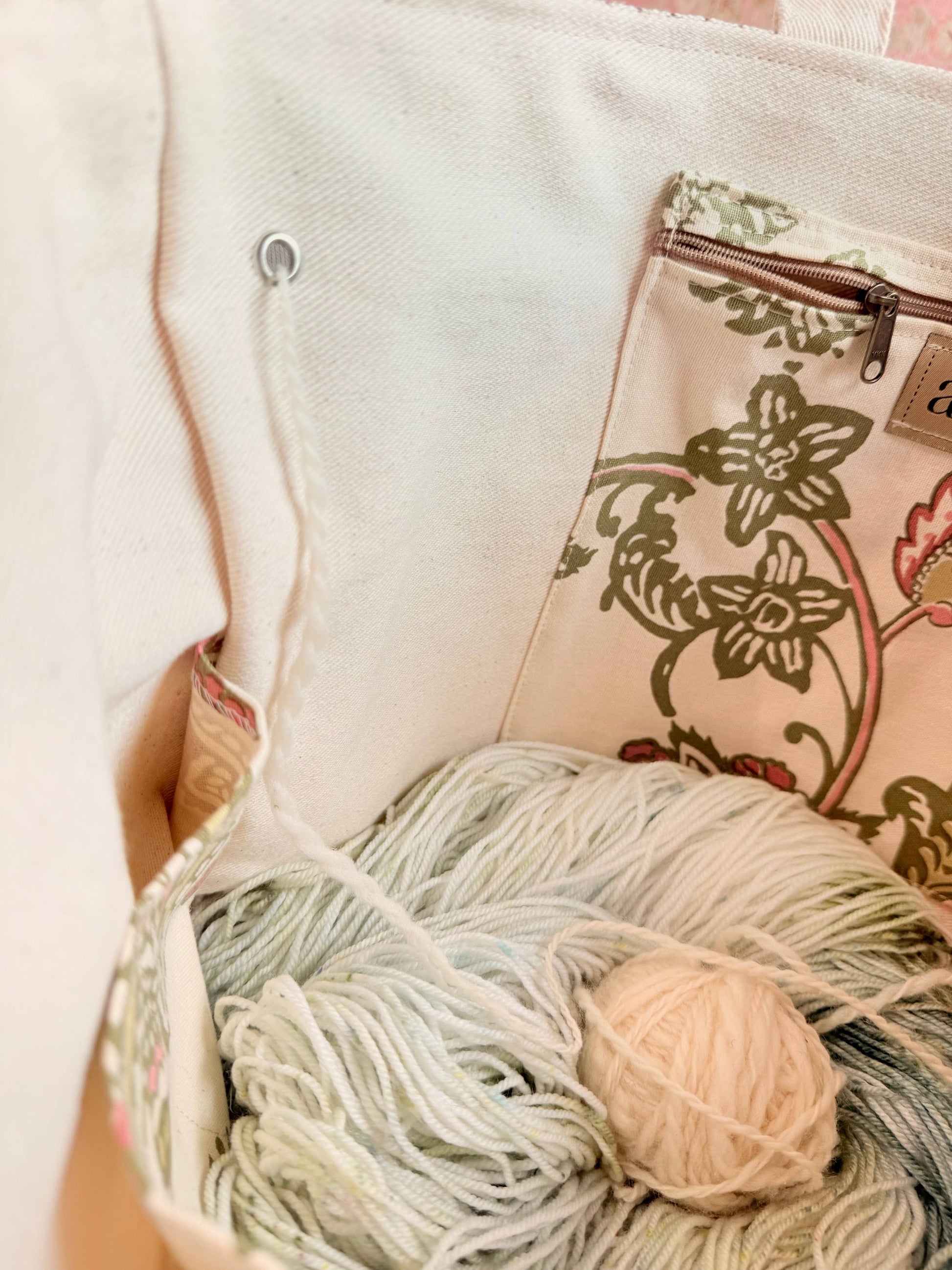 NEW! The Project Tote by Atenti. A spacious, stand-alone craft bag thoughtfully designed with the needs of serious crafters + makers + artists of all kinds in mind. Knitters, crocheters, quilters, fiber artists and more will appreciate the multitude of pockets and a detachable matching zipper pouch that hold and help organize projects, yarn, tools + notions, patterns... With a new convenient yarn-feed eyelet and wide magnetic-closure opening, this USA handmade tote keeps everything secure + easily accessible. Our Rosalie fabric features a soft, printed floral motif with muted pinks, greens, and taupes on a light, neutral base reminiscent of a block print. Atenti’s Rosalie design evokes vintage English garden prints, French country florals, or cottagecore botanical textiles. * Detachable Zipper Pouch: A coordinating pouch (7.5"x4"), perfect for small notions, is attached inside with a lobster clamp. This clamp can also be used to hang your keys or other small accessories. * Yarn Management: An eyelite (